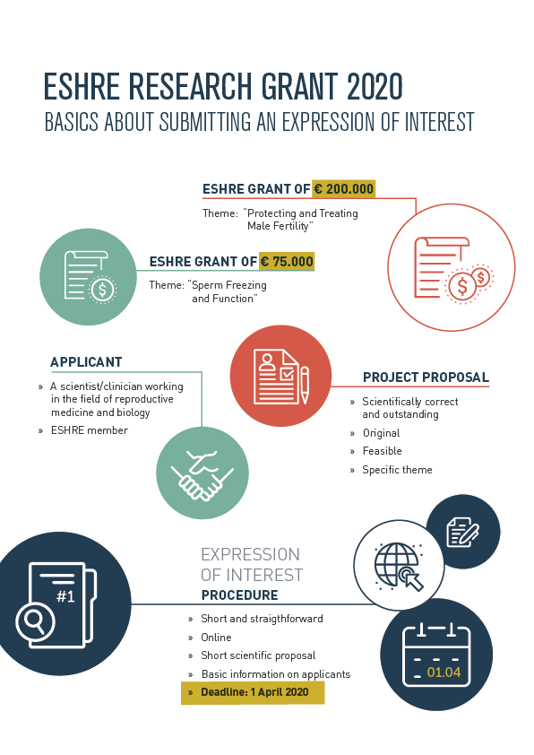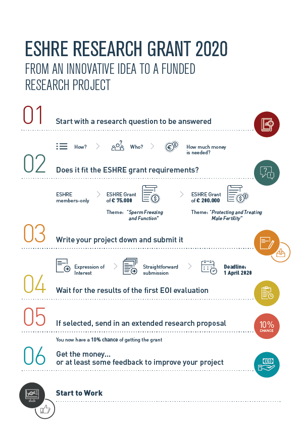 In 2020, ESHRE will award 2 Research Grants: a Research Grant of 75.000 euro and a Research Grant of 200.000 euro. Funding can be spread over up to 3 years. Applications for the 75.000 euro Grant should focus on the theme “Sperm Freezing and Function”, while applications for the 200.000 euro Grant should focus on the theme “Protecting and Treating Male Fertility”.