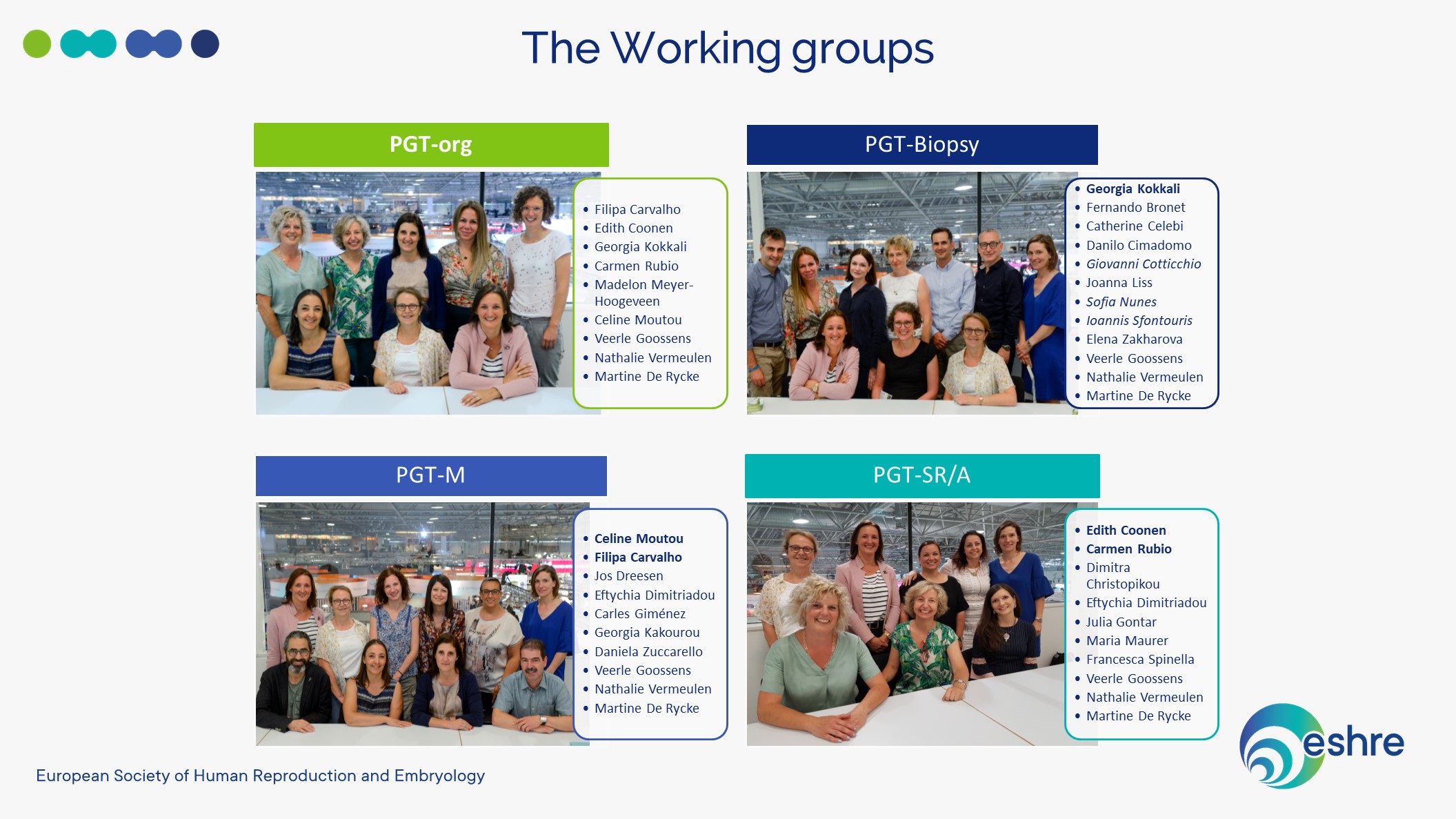 This project resulted in a series of 4 papers describing good practice recommendations for preimplantation genetic testing (PGT). The first paper includes recommendations on general aspects of PGT, such as patient selection, counselling, pregnancy and children follow-up and transport PGT. The other 3 paper cover technical aspects of biopsy and tubing, PGT-M, PGT-SR and PGT-A.