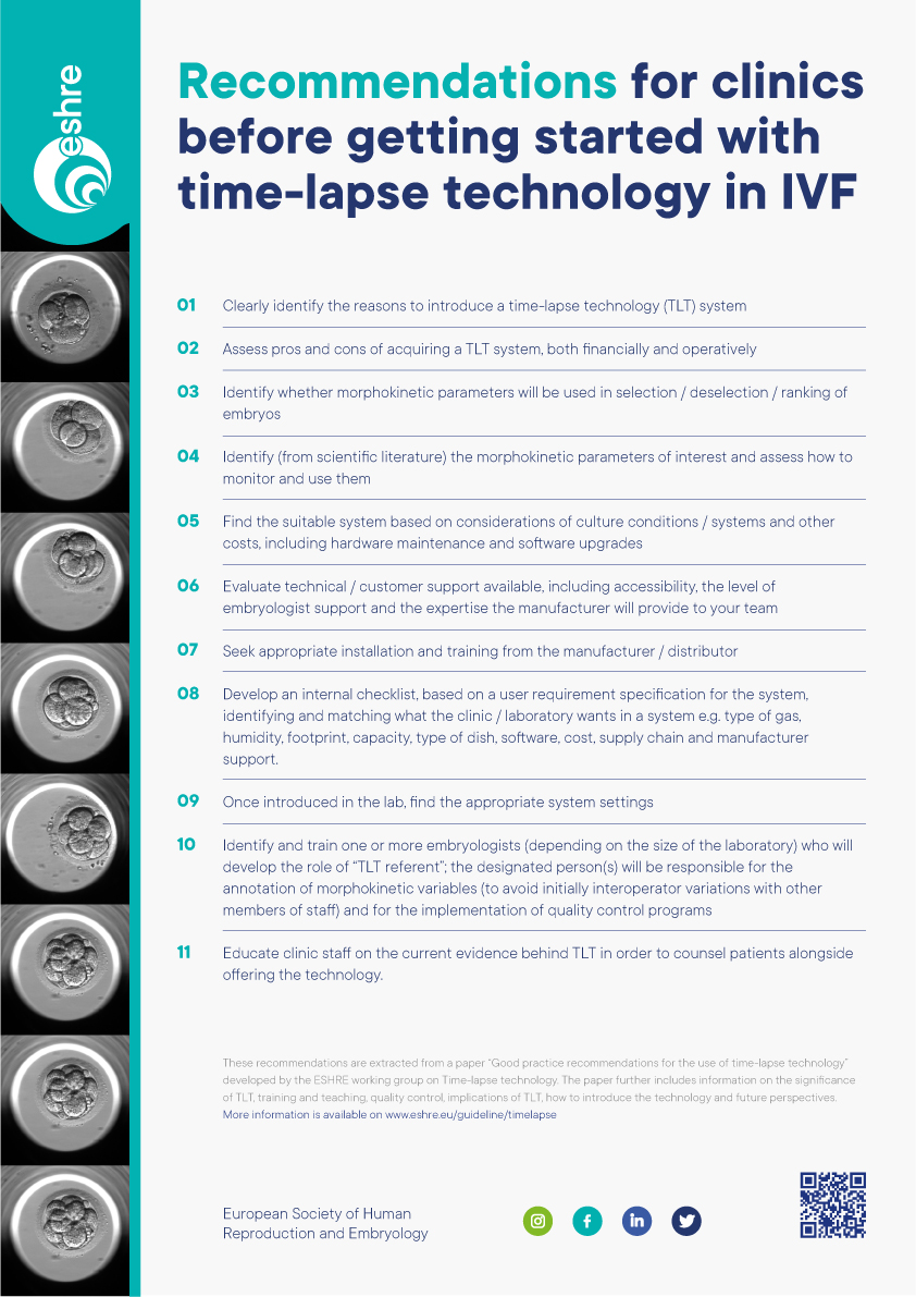 A working group of members of the Steering Committee of the ESHRE Special Interest Group in Embryology and selected ESHRE Experts prepared recommendations on the practical aspects of TLT for the IVF, based on findings from a literature search and in accordance to the manual for good practice recommendations.