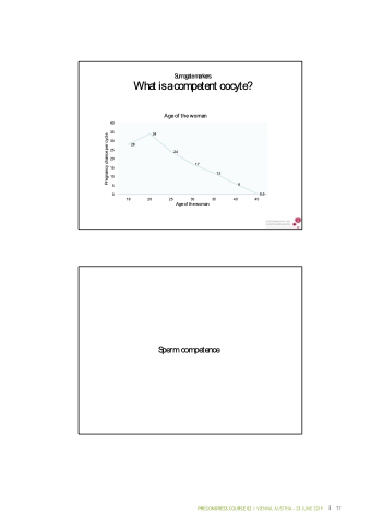 40 35 30 25 20 15 10 5 Surrogatemarkers What isacompetent oocyte? Ageof thewoman 34 28 24 17 12 6 0,5 0 18 20 25 30 35 40 45 Ageof thewoman Sperm competence 74 PRECONGRESS COURSE 02 I VIENNA, AUSTRIA – 23 JUNE 2019 77 Pregnancy chanceper cycle