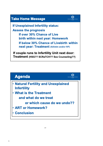Take Home Message If Unexplained Infertility status: Assess the prognosis If over 30% Chance of Live birth within next year: Homework If below 30% Chance of Livebirth within next year: Treatment (IUI/stim and/or IVF) If couple runs to Infertility Unit next door: Treatment (HSG?? SCRaTCH?? Sex Counseling??) Agenda • Natural Fertility and Unexplained Infertility • What is the Treatment and what do we treat or which cause do we undo?? • ART or Homework? • Conclusion 90 87