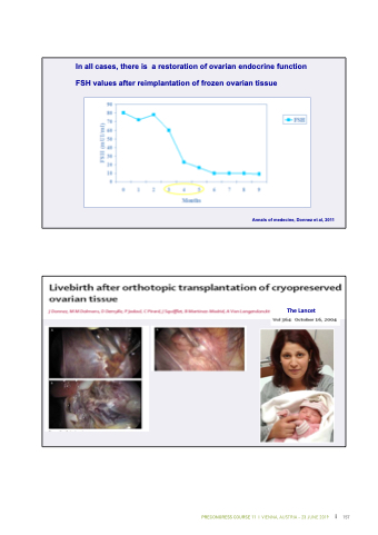 In all cases, there is a restoration of ovarian endocrine function FSH values after reimplantation of frozen ovarian tissue Annals of medecine, Donnez et al, 2011 The Lancet 154 PRECONGRESS COURSE 11 I VIENNA, AUSTRIA – 23 JUNE 2019 157